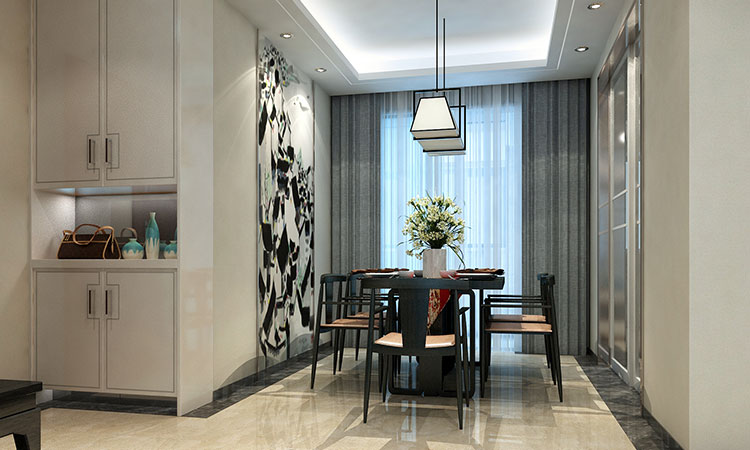 黑、白、灰為基礎的色調,簡潔硬朗的直線裝飾,內斂、質樸的家具設計,整個空間以現代的裝飾手法和家具,結合古典中式的裝飾元素,來呈現亦古亦今的空間氛圍,使生活的實用性和對傳統文化的追求同時得到了滿足。